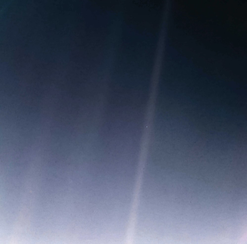 Pale Blue Dot is the most distant photograph ever taken of the Earth, a tiny speck caught in a beam of scattered sunlight. At the request of astronomer Carl Sagan (1934-1996), it was captured by NASA’s Voyager 1 from 4 billion miles away. Sagan reflected on this image in a lecture at Cornell University: “In our obscurity, in all this vastness, there is no hint that help will come from elsewhere to save us from ourselves.”